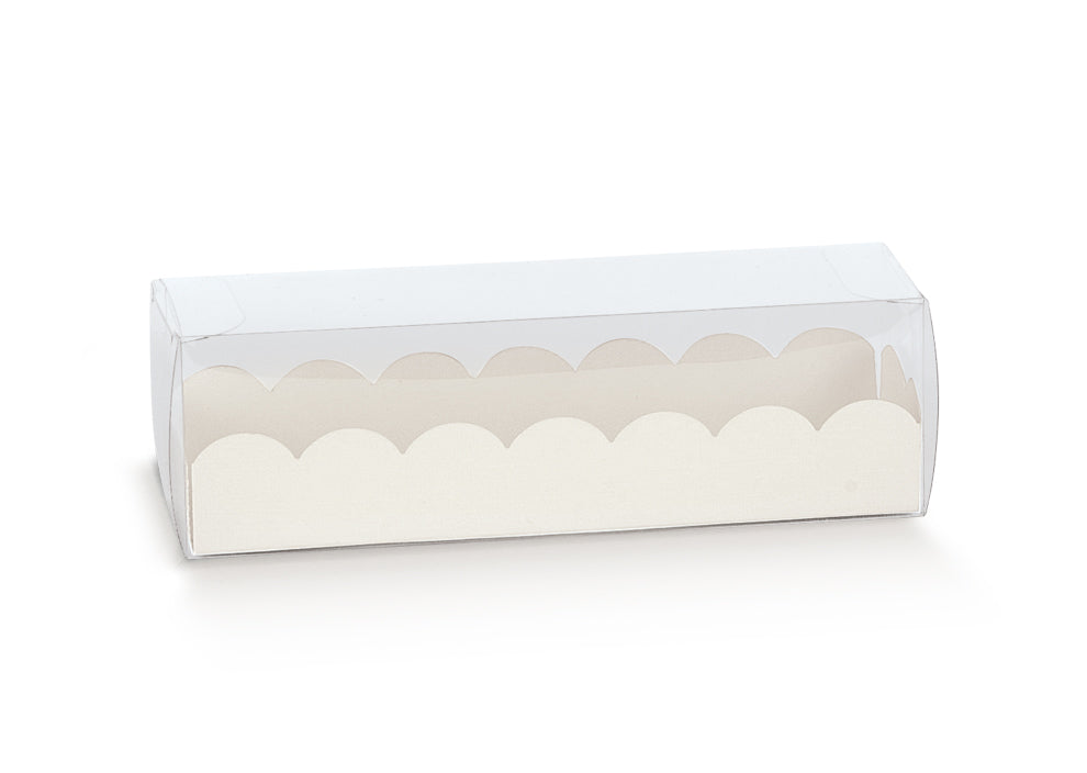 This stylish transparent box features side openings and a white pearlescent insert with an embossed leather pattern. It's the perfect blend of elegance and functionality, making it an ideal choice for showcasing your delicious treats.